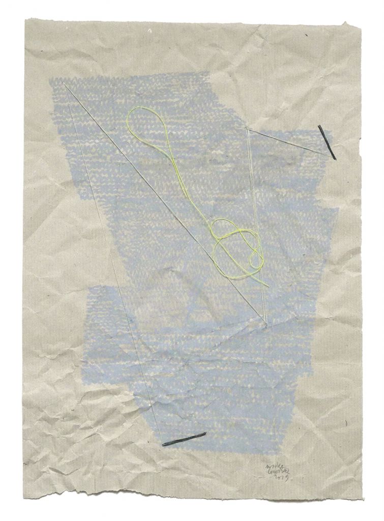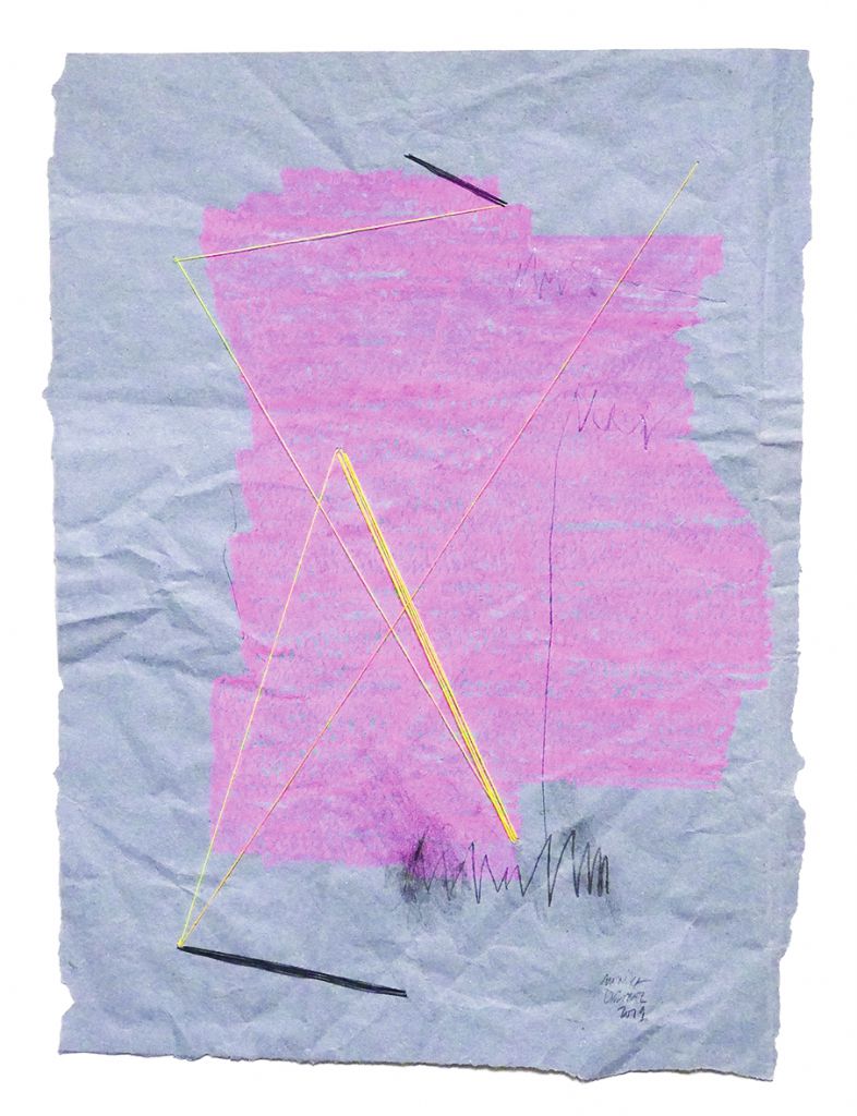 Bleistift, Buntstift und Garn auf Papier