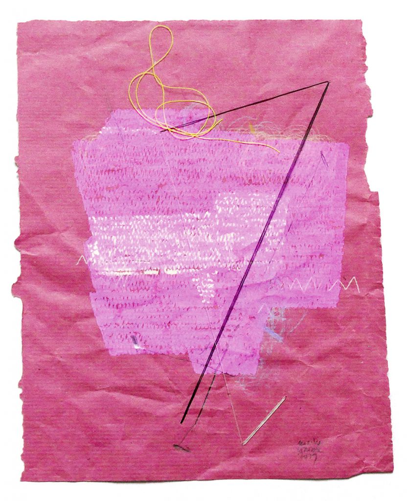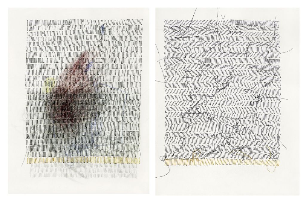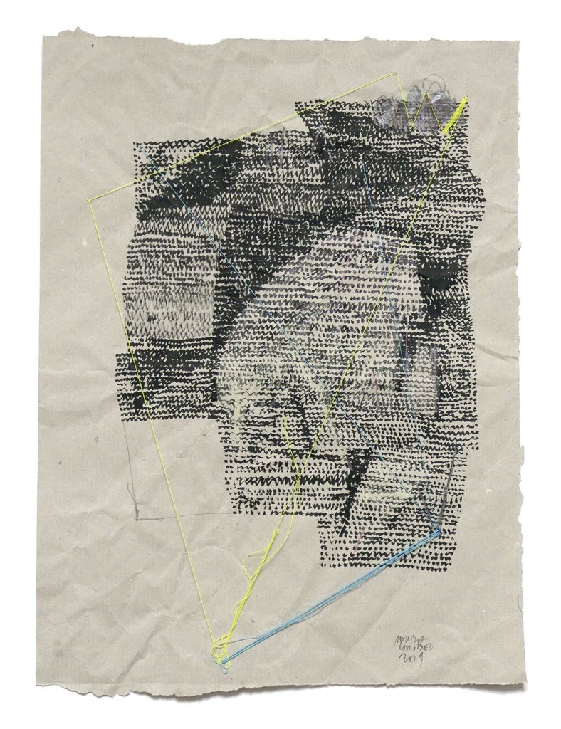 Bleistift, Druckfarbe und Garn auf Papier